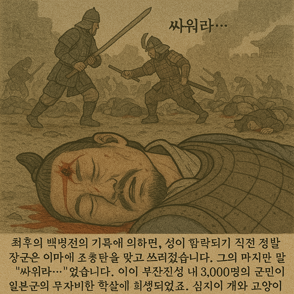 최후의 백병전^4의 기록에 의하면, 성이 함락되기 직전 정발 장군은 이마에 조총탄을 맞고 쓰러졌습니다. 그의 마지막 말은 "싸워라..."였습니다. 이어 부산진성 내 3,000명의 군민이 일본군의 무자비한 학살에 희생되었죠. 심지어 개와 고양이까지 살아있는 생물은 모조리 죽였다는^1의 증언은 당시의 참상을 적나라하게 보여줍니다.